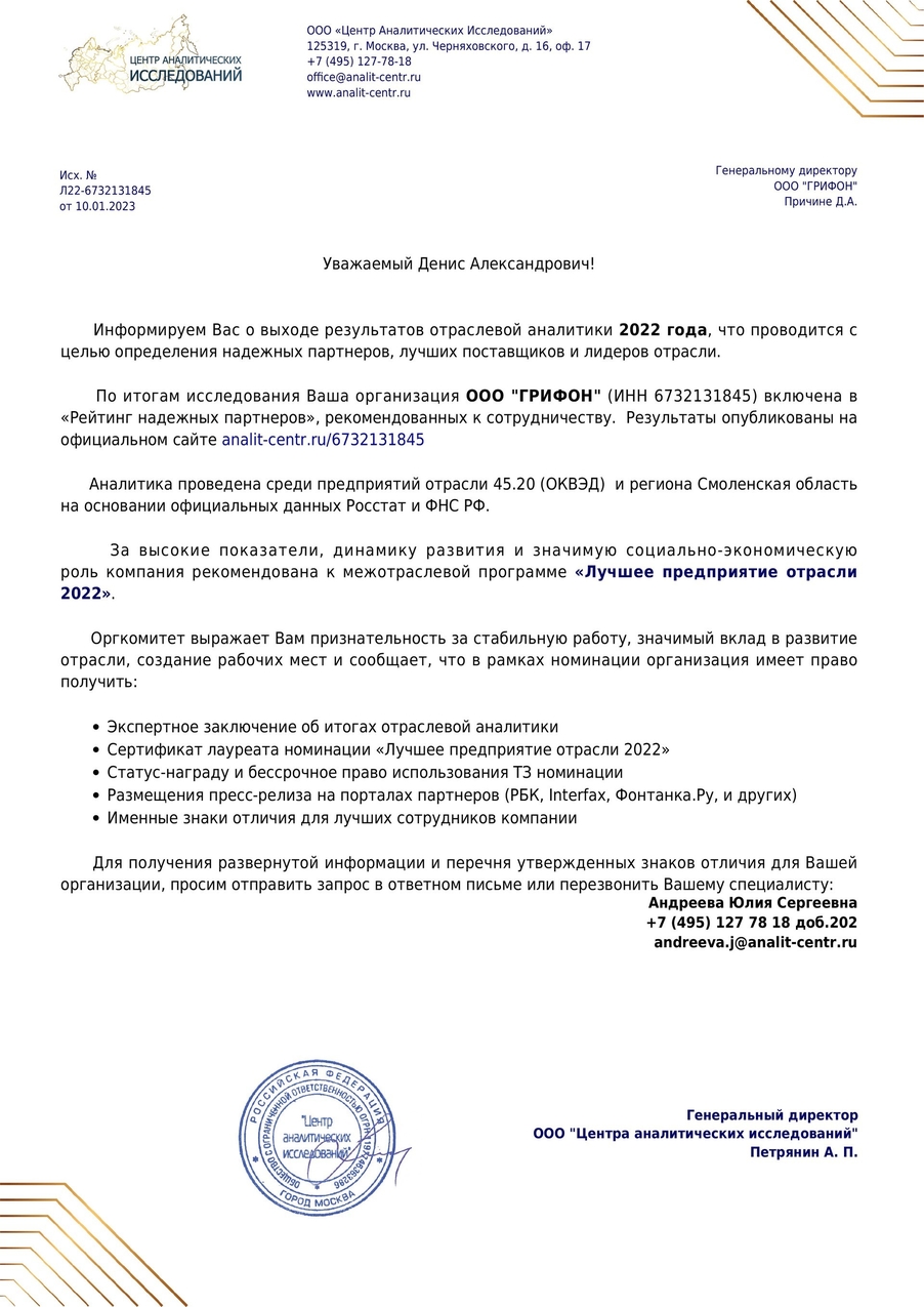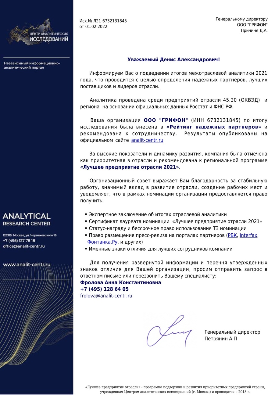 Наша компания ООО "Грифон" (ИНН 6732131845) включена в Национальный рейтинг надежных партнеров 2021!
